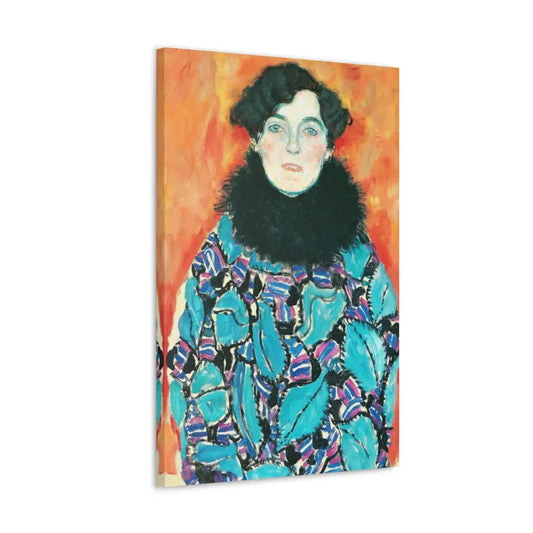 Vintage Gustav Klimt Canvas Art: Elegant Lady in Blue Dress on Red Background - johanna staude